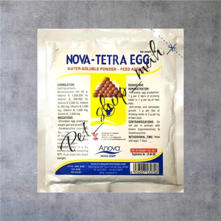 داروی نوا تترا اگ (Nova-Tetra Egg) یک پودر محلول در آب است که با داشتن ترکیب ویتامینها و آنتیبیوتیک اکسیتتراسایکلین به پرندگان کمک میکند تخمگذاری بیشتری داشته باشند، سریعتر رشد کنند و از بیماریهای تنفسی و عفونتها پیشگیری شود.