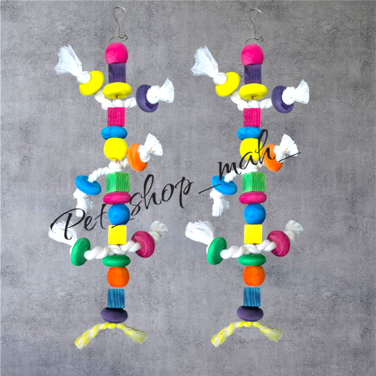 اسباببازی چوبی طنابی رنگی پرندگان با طراحی جذاب و رنگهای شاد، یک وسیلهی کاربردی برای تحریک ذهنی و فیزیکی طوطیسانان از جمله عروس هلندی، مرغ عشق، طوطی برزیلی و کاکاتیل است.